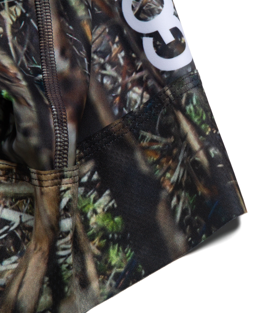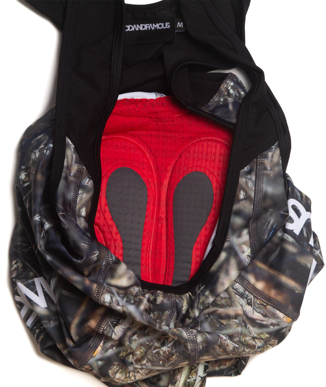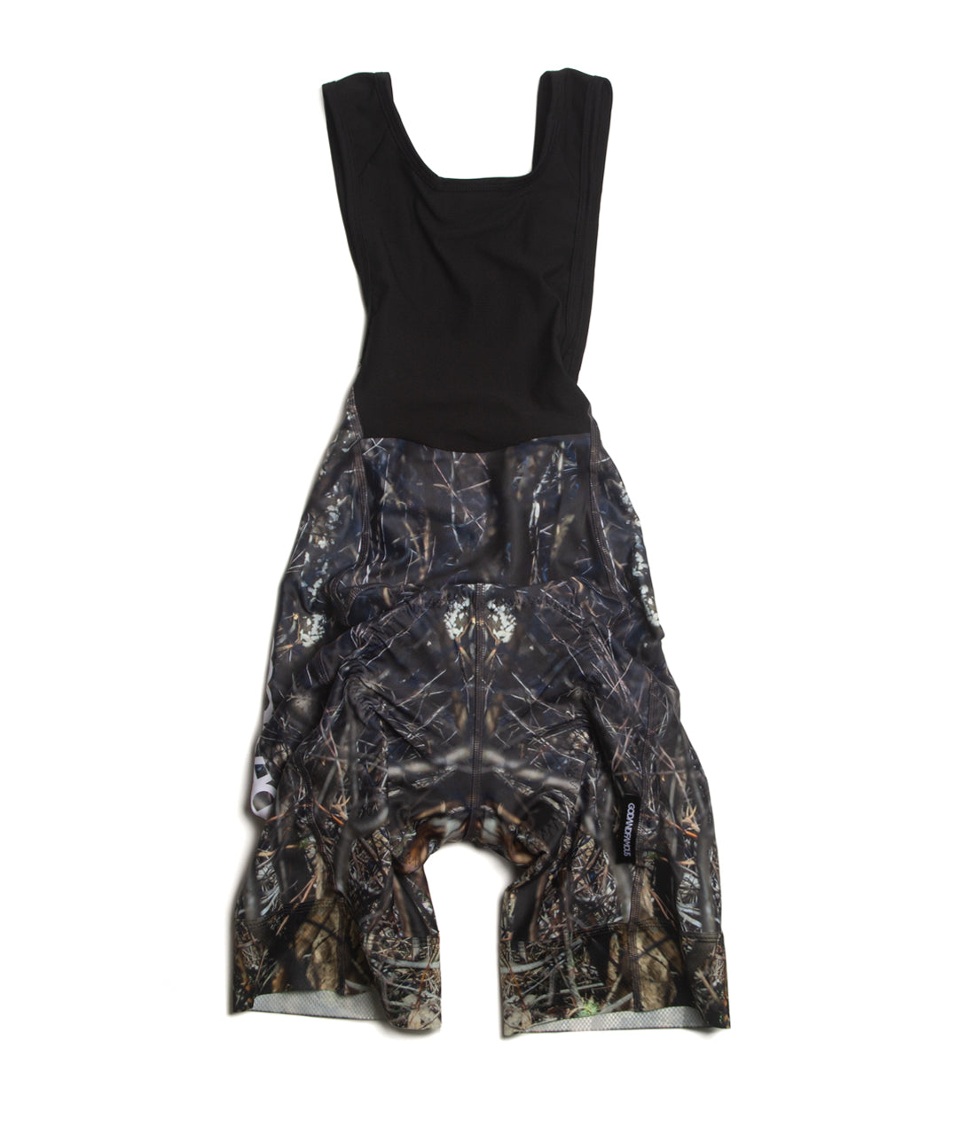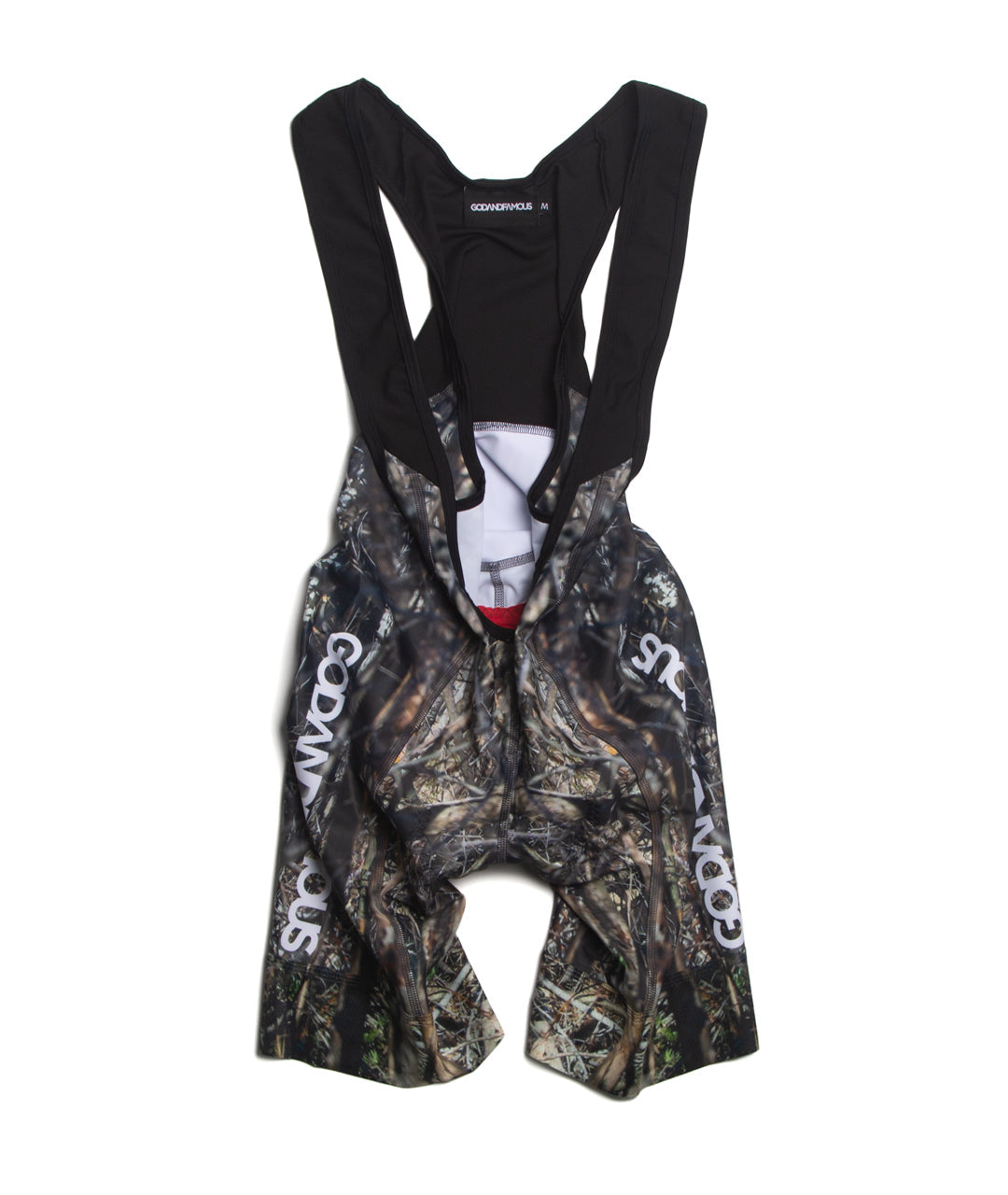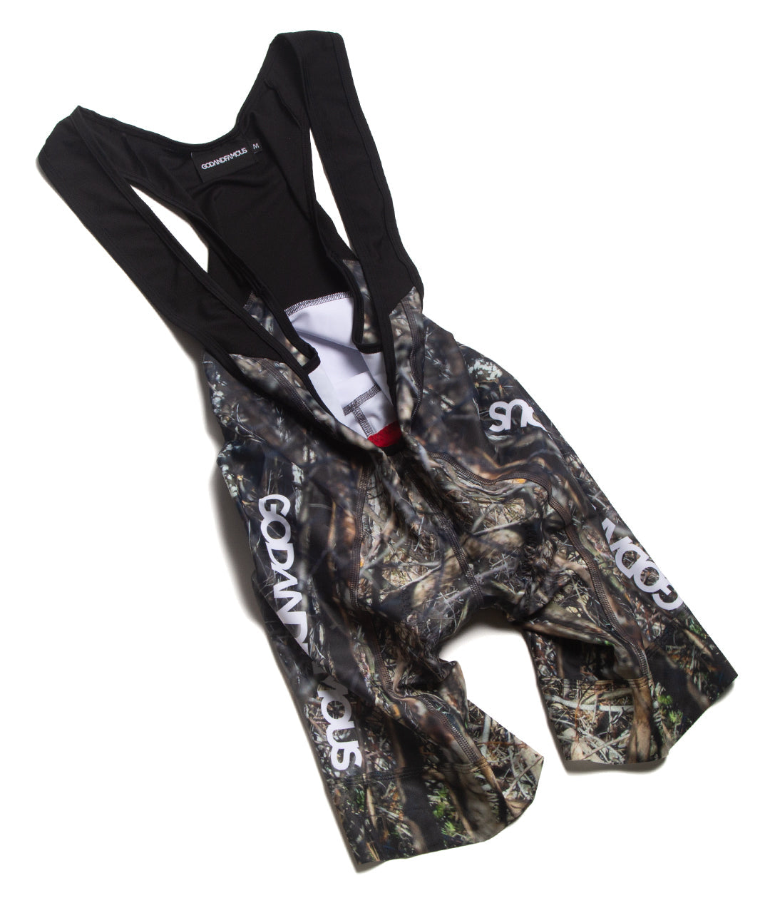 A cycling bib short with oversized G&F livery on both leg panels. Featuring an all-over real tree camouflage print pattern.
